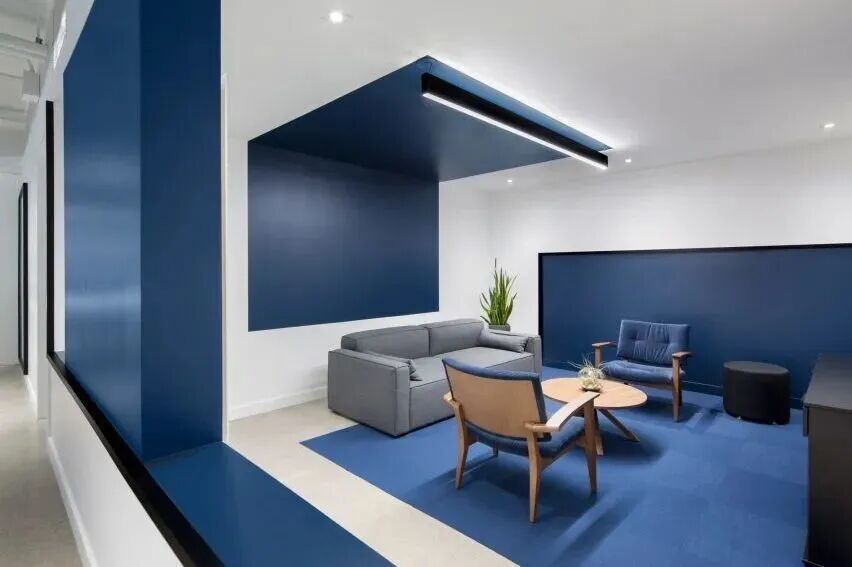将LOGO的色彩应用到实际空间中,并延伸出相应的线条辅助图形,使整体空间与公司形象相匹配。蓝白的色彩与不规则的色块分布显露出一丝轻快,排列有序的工位布置和室内软装又增添一些秩序感,两者相互碰撞又相互融合,共同营造出了和谐的室内空间效果。